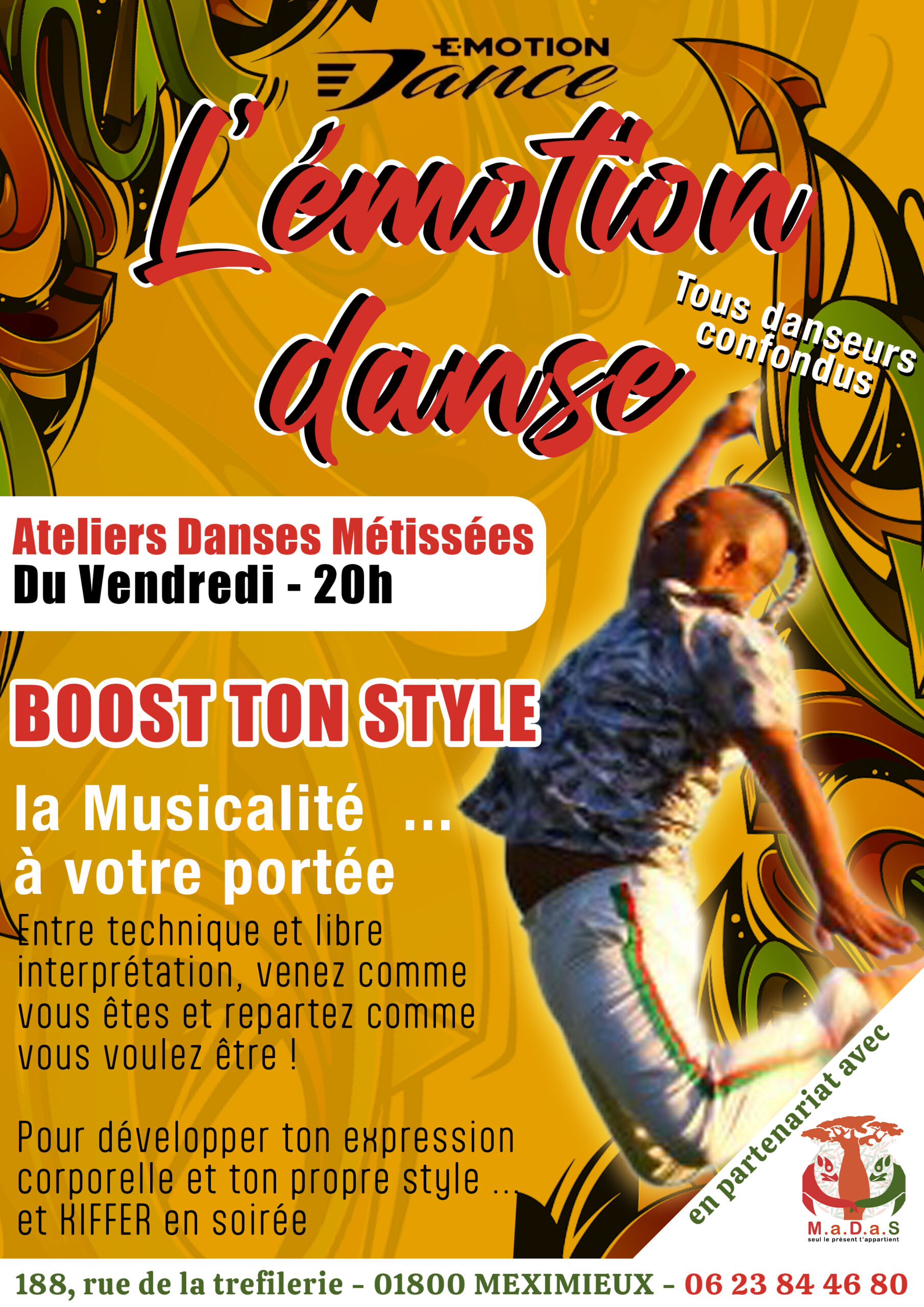 Inédit sur la région : rendez-vous le VENDREDI 07 NOVEMBRE 2025 - De 20H à 23h Chez E-Motion Dance Meximieux Quel que soit ta danse, nous sommes là pour partager un grand moment de plaisir. - 1h30 de shines, gestuelles, musicalité JAZZ SWING & AFROCUBAIN - 1h30 de pratique guidée...